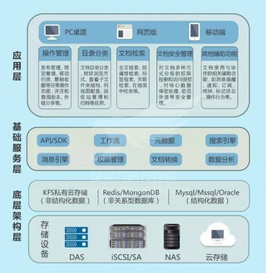 根据企业数据安全存储、文档管理、文档检索、协同办公等需求,企业文库管理平台按照三层系统结构进行设计,可分为底层架构层、基础服务层、应用层三个部分。如图所示: