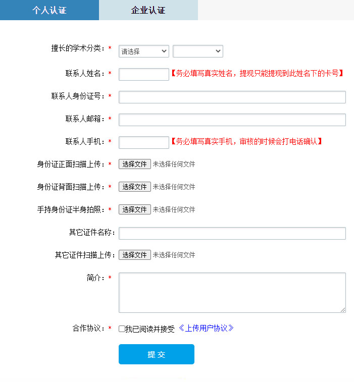会员点击“个人认证”后出现以下表单,请认真填写,并上传相应的图片资料证明(图片资料最好是手机拍照后不要直接上传,而是用电脑打开图片后,用qq截图保存后,再将截图保存的图片上传,这样能避免图片文档过大的问题)