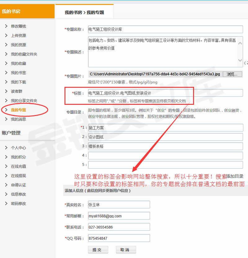 第一步:会员登陆后,在左侧栏菜单中找到“我的专题”,并按页面上的要求填写专题名称,描述,图片,标签,专题目录等信息,填写完提交后,等管理员审核。