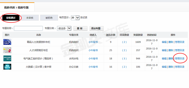 第二步:专题经管理员审核后,在“我的专题”里面能看到“审核通过”下面有了刚刚创建的专题,这时候点击右侧“管理目录”