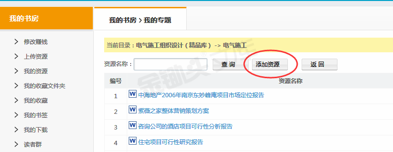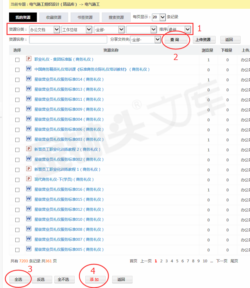 第五步:这时候你看到的是你以前上传的所有资料,请按下图所示进行筛选,列出你需要归类到专题中的文档,然后点击左下方的“全选”,再添加“添加”按钮,专题内容即添加完成。