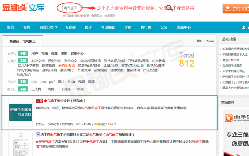 4、搜索优先:在金锄头网搜索内容时,系统会根据专题已设置标签进行优先检索排序,专题会显示在搜索结果的最前面,对增加访问量起到很重要的作用,这也是为什么专题的交易量要高很多的原因。