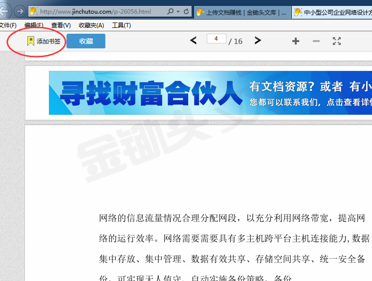 我的书签,这个功能很好理解,当在金锄头文库看一篇比较长的文档,看到某页时点一下以图所示的“添加书签”,它会当前阅读记录页数,下次打开时,它可以自动从书签的页数位置部份开始阅读。