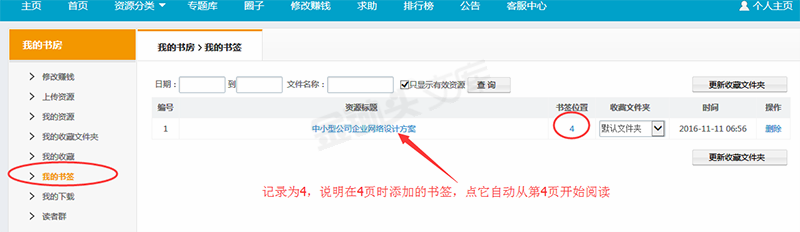 会员登陆后,在左侧栏“我的书房”展开看到“我的书签”,点击